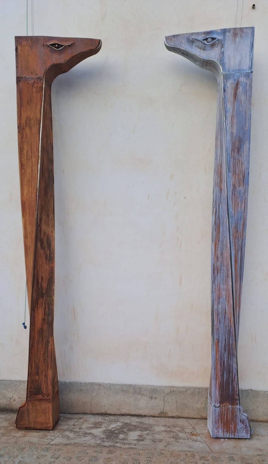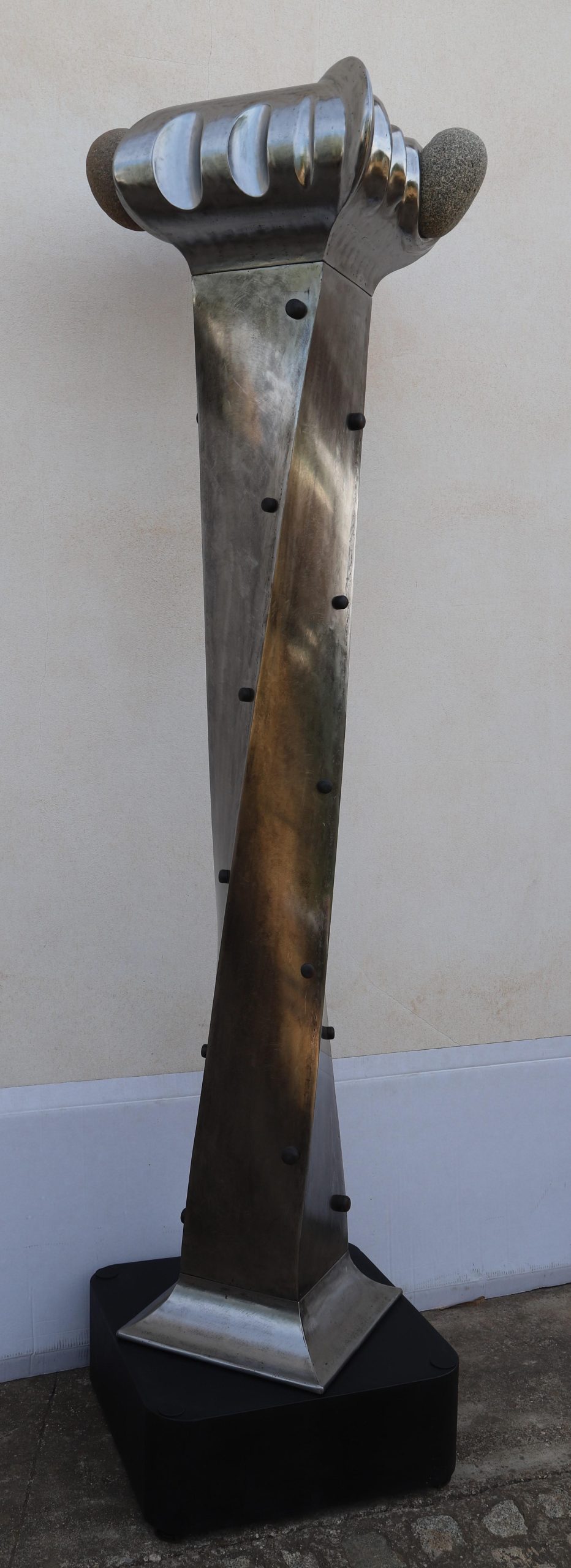 Estas esculturas destacan por su singularidad formal y conceptual. Cada fuste, construido a partir de planchas de hierro con base cuadrada, ha sido torsionado 90º, dando lugar a una estructura dinámica y poderosa. Los capiteles y las bases, elaborados de forma totalmente artesanal, evocan referencias de la cultura andalusí: el universo ecuestre, el agua como símbolo de vida y otros elementos esenciales del imaginario histórico del sur.