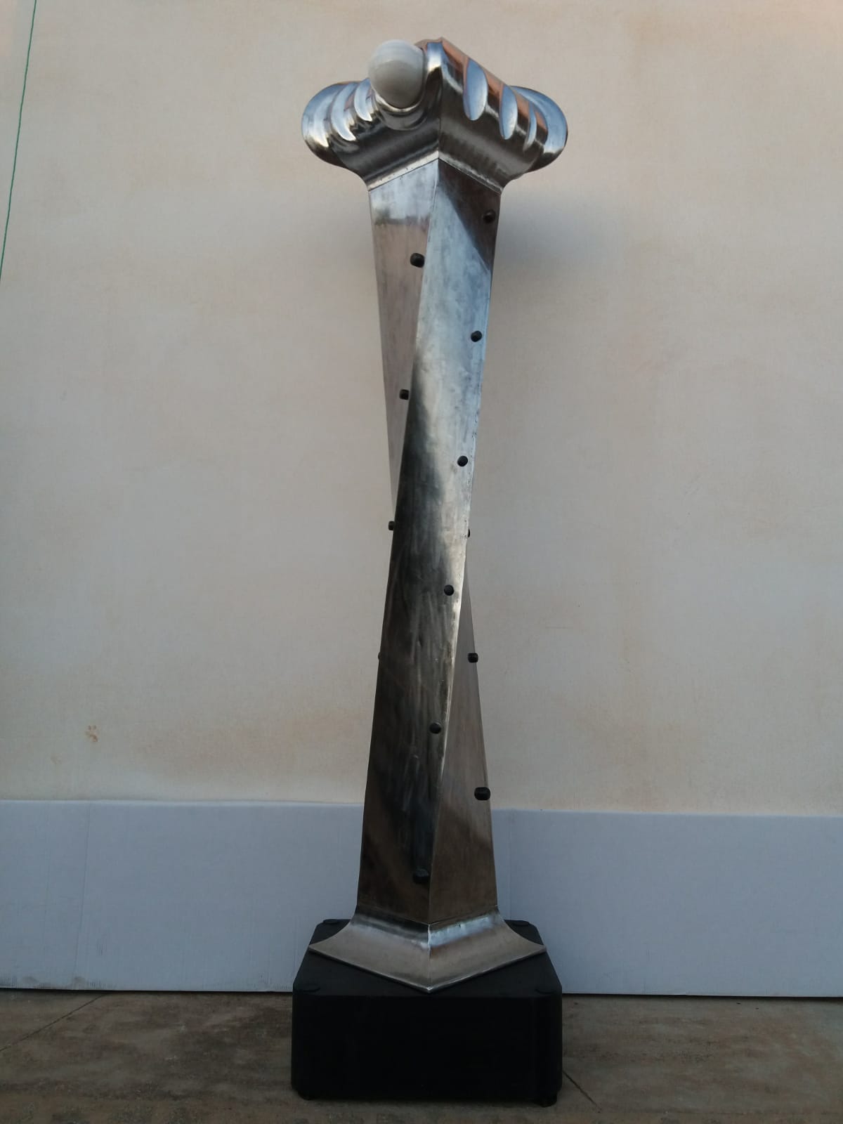 Escultura en hierro que evoca, al mismo tiempo, la silueta de una media luna y la fuerza de un asta de toro, rematada por un ojo pulido que hipnotiza.